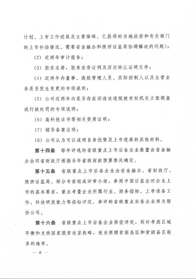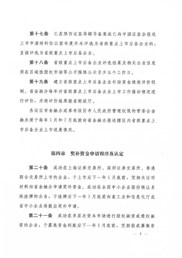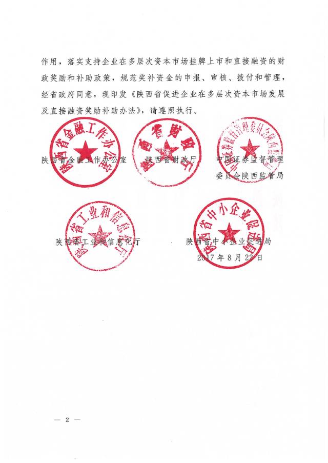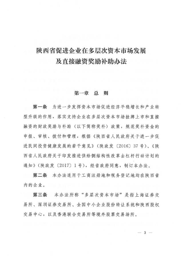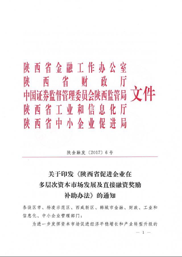 为加快推进我省企业利用多层次资本市场,支持企业通过资本市场做大做强。在经济新常态下,增强各类经济体尤其是非公经济体的活跃度和核心竞争力,8月22日,陕西省金融办、省财政厅、陕西证监局、省工信厅及省中小企业促进局等部门联合出台了《关于印发<陕西省促进企业在多层次资本市场发展及直接融资奖励补助办法>的通知》(陕金融发〔2017〕6号)(以下简称“《办法》”)。