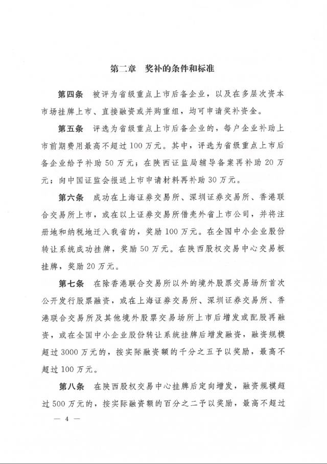 《办法》从企业挂牌上市、直接融资等两个主要方面明确企业可以获得的资金扶持,同时为确保政策能够落地实施,《办法》进一步指出补贴的申领条件及拨付方式。《办法》规定,凡在在深沪交易所、香港联合交易所上市的,给予100万元奖励;在中国中小股转系统成功挂牌,奖励50万元;在陕西股权交易中心交易板挂牌,奖励20万元。《办法》指出,对于在主板市场、“新三板”上市后增发或配股再融资,规模超过3000万元的,按实际融资额千分之五予以奖励;对于在多层次资本市场定向增发购买资产,交易价格超过5亿元的,按交易价格的万分之二予以奖励;发行公司通过公司债、企业债等方式进行债务融资,融资规模在5000万元以上且期限达到或超过2年的,按实际融资额的万分之五乘以存续年限予以奖励;通过在陕西股权交易中心挂牌后定向增发,融资规模超过500万元的,按实际融资额的百分之二予以奖励。